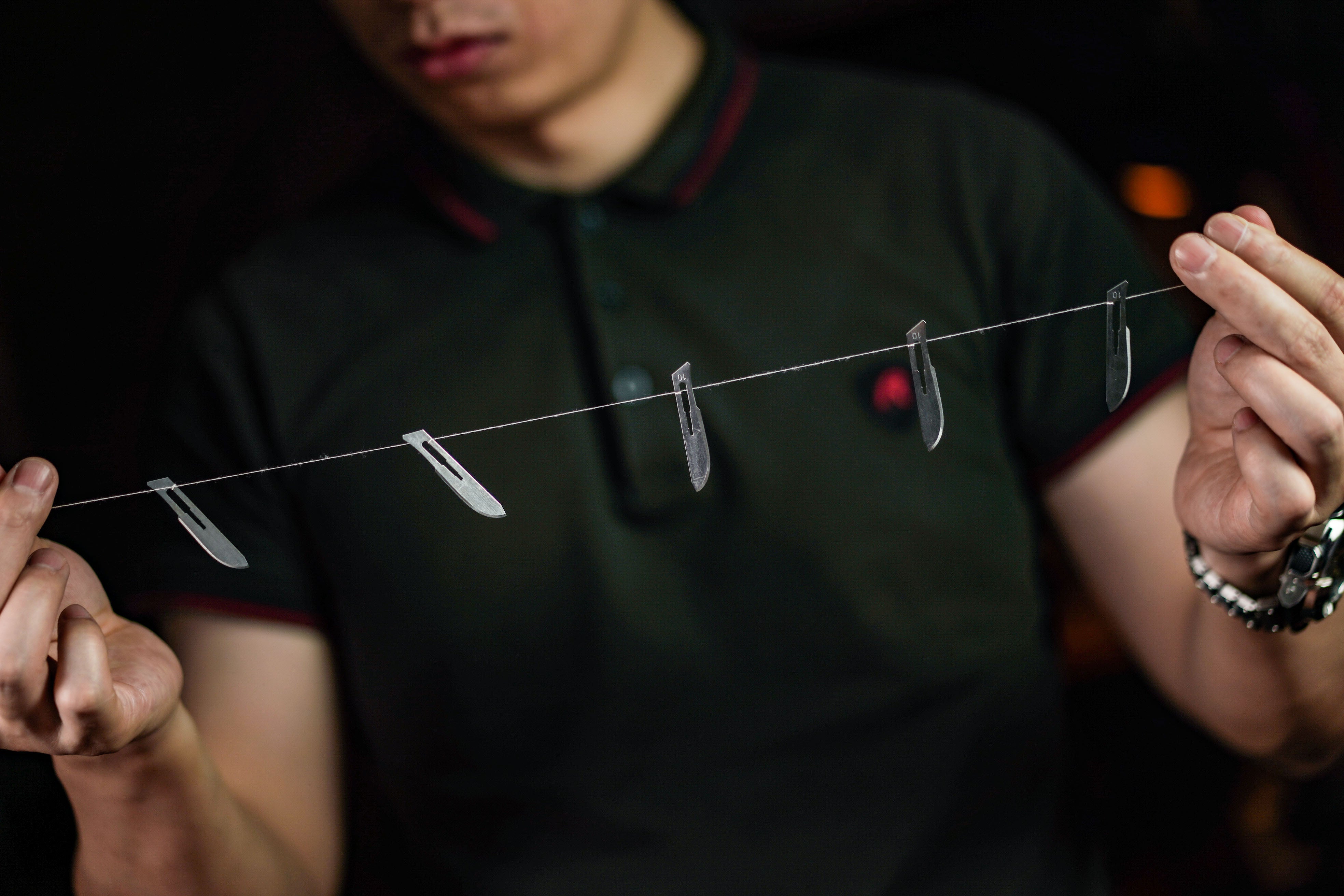Magically, the blades swallowed by the magician are now strung one by one on the thread as the thread is pulled out. The magician remains unharmed.