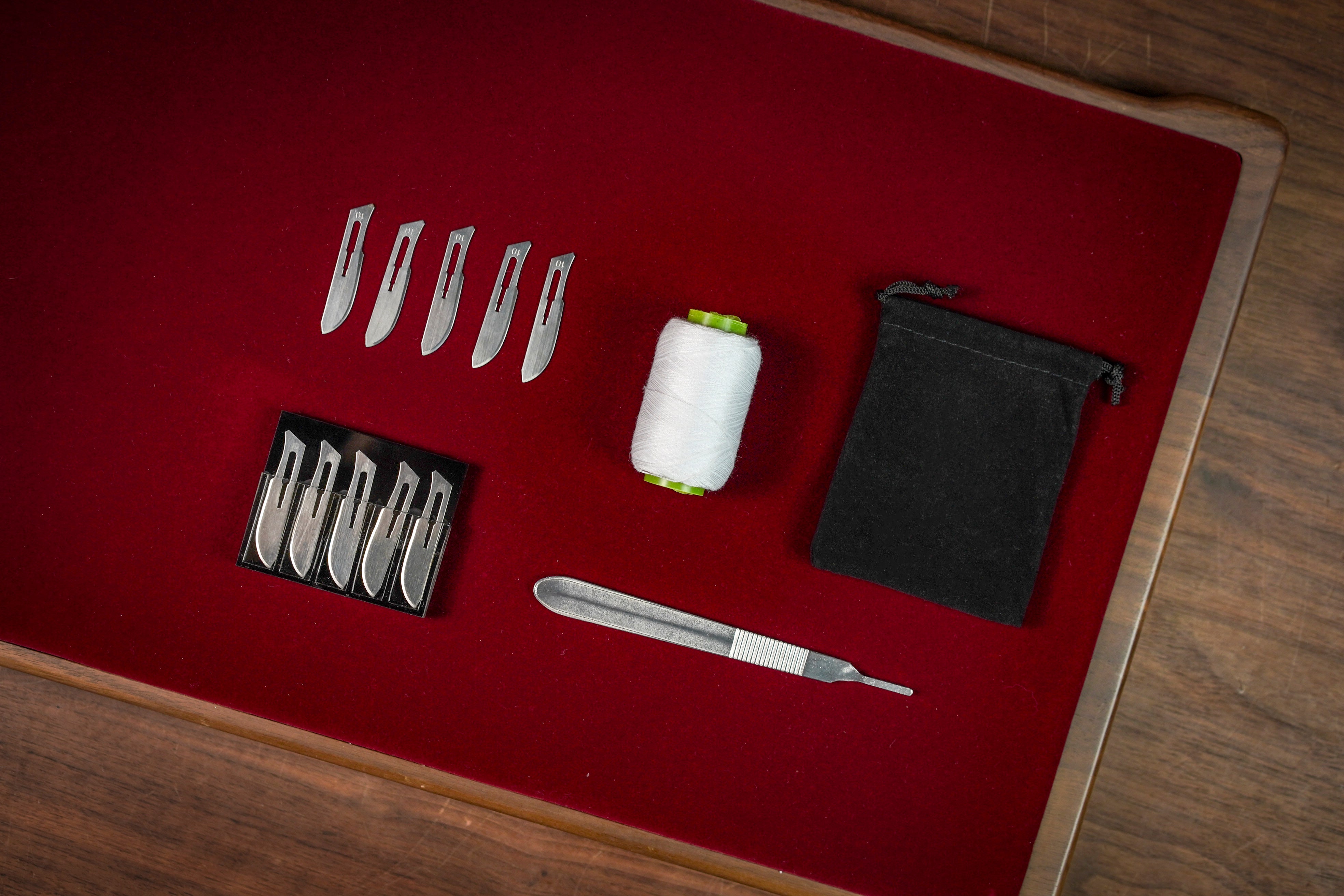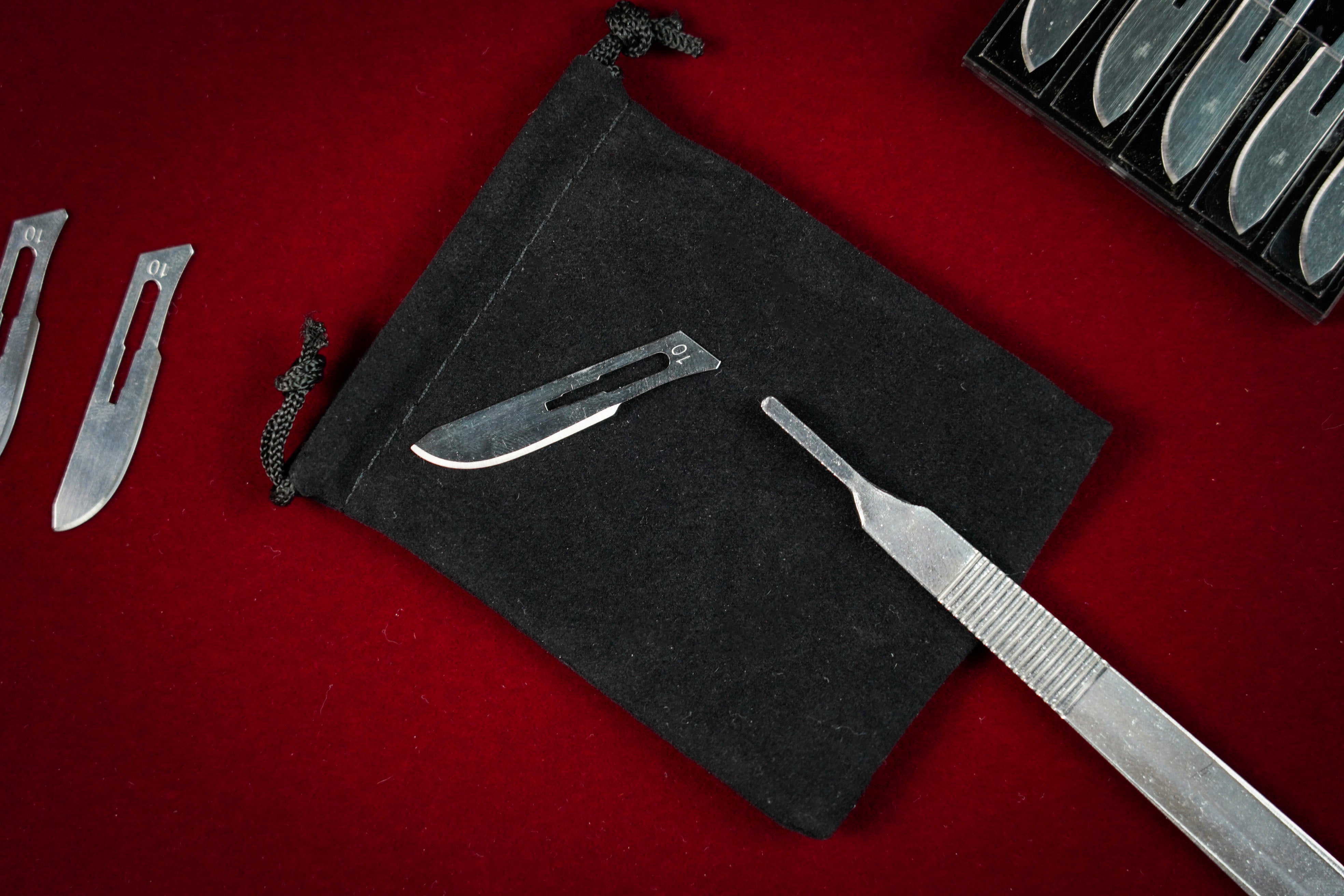 - A scalpel holder that allows for the quick assembly and removal of blades with one's bare hands, making it more ritualistic and safer for the audience to examine the blades, and more visible during stage performances.