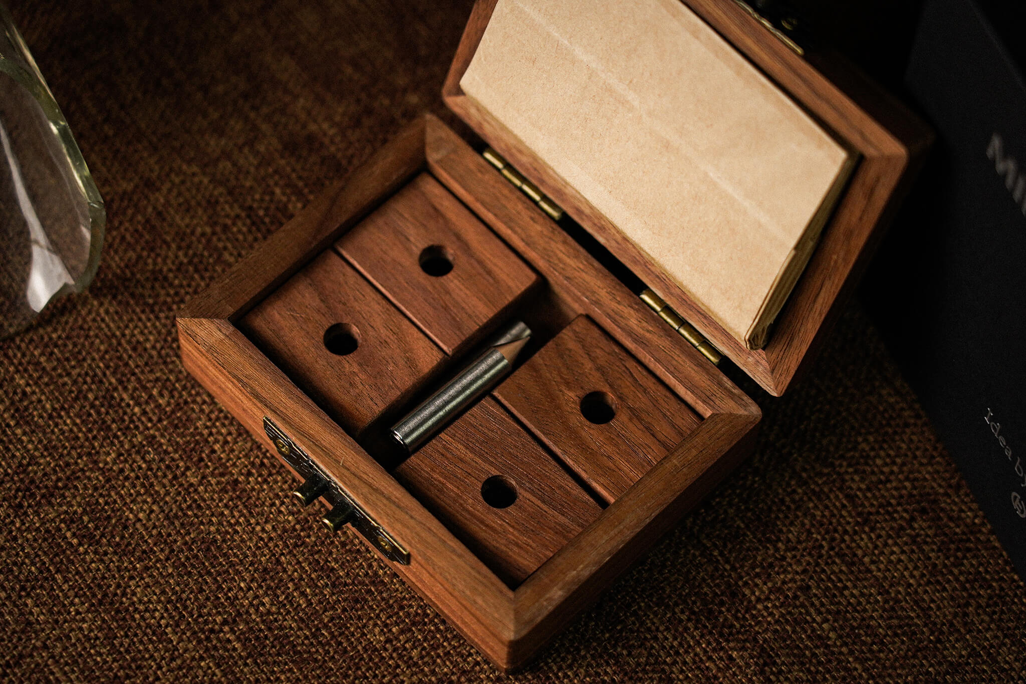 The above items are contained in a compact North American Black Walnut box that can be used to introduce the props into the performance.